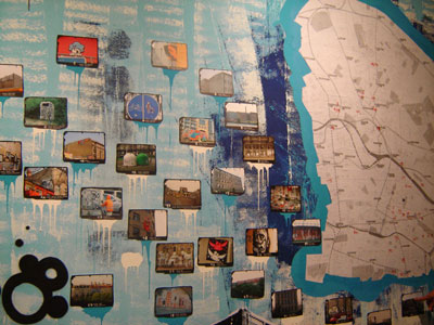 מפת אמנות רחוב בקרוויצברג, Backjumps גודל אינו רק אמצעי שנועד לעשות רושם. יש לו גם משמעות ביקורתית. לצייר ציור קיר ענק בעיר הנכבשת על-ידי תאגידי ענק זה מעשה פוליטי, ואמנות רחוב טובה מעלה שאלות כמו מי הבעלים של המרחב הציבורי, את מי החוק משרת ומה ומי באמת העבריינים. כשבלו וחבריו מציירים על הקירות ברחבי העיר הם עוסקים גם בחופש הדיבור, ושואלים לא רק למי יש זכות להישמע אלא גם למי היכולת להביע את עצמו. הם משתמשים בכוחה של אמנות רחוב כדי להילחם בכוחות כלכליים וחברתיים גדולים מהם. העבודות הטובות בתערוכות הם של האמנים שהבינו שעבודות שמוזמנות לגלריה, למקום האוטונומי של עולם האמנות צריכות להיות יותר מורכבות, פחות צועקות ובקיצור מתאימות לסביבה. חבל שאמנים טובים רבים פספסו את הנקודה. קיר של בלו בקרוויצברג (אפשר לראות עוד תמונות כאן) בלו, באקג'מפס. הוידאו הזה הוצג במרכז החדר בלופ, הקירות עדיין הציגו את הכתמים מהציורים עוד לינקים: