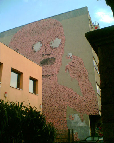 בלו וJR בעבודה משותפת מול התערוכהPlanet-Prozess אמנות רחוב עובדת ברחוב, ויש גורמים רבים שהופכים את העבודה לחזקה. למשל תחושת ההפתעה שנגרמת בהיתקלות בעבודה במקום לא צפוי, ההתאמה או אי-ההתאמה של העבודה לסביבה, השימוש בארכיטקטורה, השימוש בחומרים פשוטים כדי להעביר מסרים פשוטים וישירים בצורה חדשה לגמרי ועוד. לפעמים כוחה של העבודה בא לידי ביטוי בגודלה. בעבודות של בלו (אמן מבלוניה, איטליה), שצייר על בנינים מחוץ לגלריה, אפשר היה לראות איך מימדי העבודה פשוט עושים אותה. לו אותם הציורים היו מוצגים בגלריה אני מניח שהייתי נשאר אדיש. אז כן, ברור שצריך לדעת לרשום (ובלו ללא ספק יודע לרשום), אבל עיקר האפקט נוצר בזכות המימדים. העבודות של בלו מרגשות, הם מעלות חיוך ובו בזמן מטרידות.