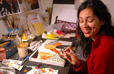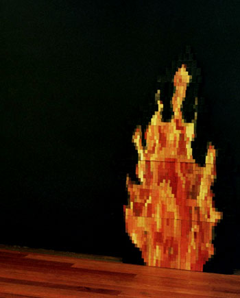 "אש" - טכניקה מעורבת על קופסאות גפרורים 170x100 "שהיד" – עבודה המתכתבת עם ציורי האיקונות של קדושים מימי הביניים. העבודה מתארת מחבל שצולם לפני יציאתו למבצע התאבדות כשהילה מוזהבת, עוטפת את ראשו.