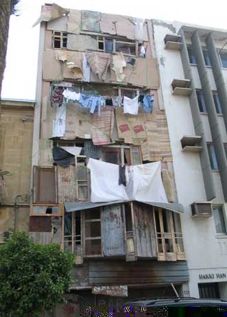 "כביסה פיקטיבית, חתיכות קרטון וג'אנק שנתלו בבית דירות". ארדן קוסובה וקטרינה גרגוס, האזור המפורז בניקוסיה, קפריסין