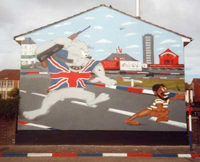בדומה לפריחת המסגדים ביגוסלביה, גם ציורי הקיר בגלזגו, שהראה פרנסיס מקי, הם דוגמה לחתרנות חזותית שבאה לאו דווקא מצד אמנים, אלא מתוך התנגדות עממית. מקי, אוצר הפסטיבל לאמנות עכשווית בגלזגו ומנהל המרכז לאמנות עכשווית בעיר, נתן הרצאה מצחיקה-עצובה על המציאות של האזור שממנו בא. בניגוד לדוברים אחרים, שהביאו התייחסות של אמנים או ארכיטקטים לסיטואציות מלחמתיות בריכוזי אוכלוסייה אזרחית, מקי הראה תגובות עממיות שמתייחסות למציאות זו – בעיקר ציורי קיר. ציורים אלה נראים כמו גרפיטי מושקע, מבוססים על סגנונות שבטיים-קלטיים ומזכירים עטיפות תקליטים משנות השבעים, דפים מהגדה של פסח ופוסטרים של שאהידים. מלבד התייחסות ישירה למציאות בגלזגו ובבלפסט (תמרור שמזהיר בפני מסוקי קרב שעלולים ליפול, תמרור שמודיע על "כובשים בפעולה") יש לאירים מודעות בינלאומית והזדהות עם עמים מדוכאים אחרים בעולם (כמו פלסטינים או ערבים אחרים שהלבנים כבשו את ארצותיהם) וגם התייחסויות לתרבות הפופ (כמו שימוש בדיוקן הנסיכה דיאנה). ישנה קבוצה של אמנים "אמיתיים" שהתייחסה למציאות האימה בין קתולים ופרוטסטנטים באירלנד. כמה מהם נחשדו בתועמלנות, כמה מהם נעצרו או נהרגו. אחרים, בעיקר מוזיקאים כמו ואן מוריסון והצ'יפטיינס וסופרים כמו גארי מיטשל, זכו לפרסום עולמי.