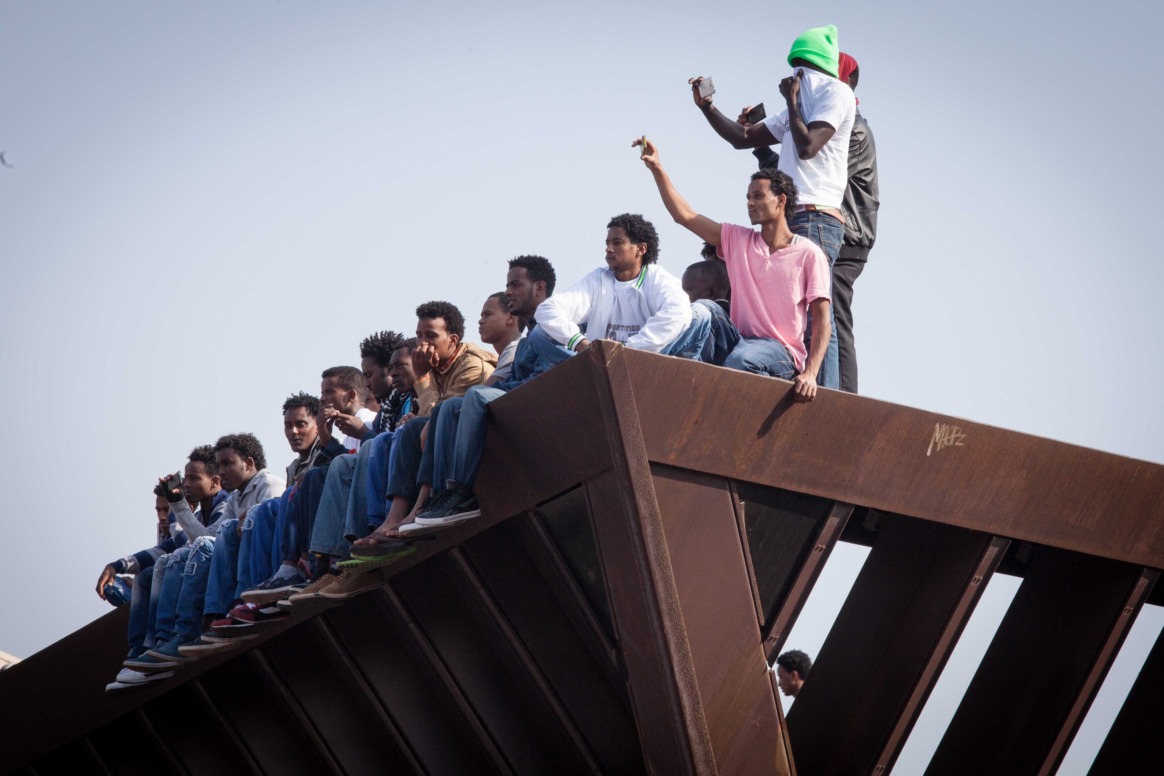 The photograph documents a moment in the demonstration organized by African refugees in Tel Aviv’s Rabin Square against their mistreatment at the hands of the Israeli authorities. The photograph captures a line of young men sitting on the monument in the square, watching the events taking place below. Interestingly, sociopolitical events that belong to different times and places are crammed into this single frame: the revival of European Jews and commemoration of the Holocaust as manifested by the memorial monument, the modern civil city that “never stops” as the setting of this event, and the horrible civil wars in Africa embodied by the young men.