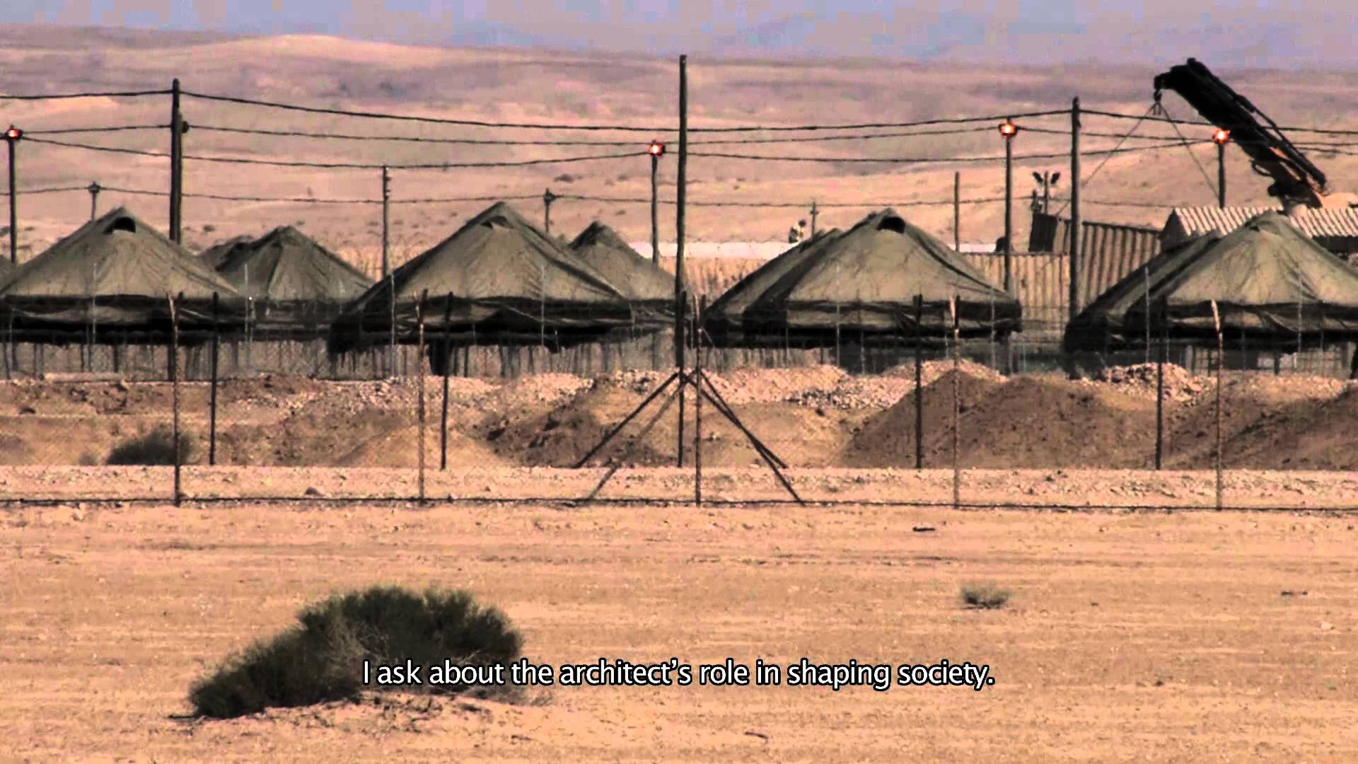 The film documents the construction of the “Tent City” detention facility in Nahal Raviv in the Negev. The facility was built to accommodate refugees who came to Israel from Africa illegally, but was ultimately never used. In the film’s soundtrack Evron reads excerpts from an interview he held with the architect who designed the facility (“An architect does not have to check the policies of the government that you and I elected”; “Architecture has always been associated with big money and political power”). The film points to the moral responsibility inherent in the architect’s work.