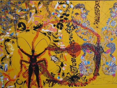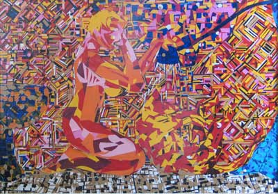 נשיות קבלית, דלזיאנית, חייתית ומיסטית שאינה מפסיקה להתרבות ולפעפע. על עבודותיה של דנה לין דנה לין מציירת מאז שהיא זוכרת את עצמה. בגיל 21 היא עבדה בהדבקת שלטים למשך חודש, ונהגה לקחת שאריות הביתה ולשחק איתן. בהדרגה זו הפכה לטכניקה המרכזית שלה. גזרי המדבקות, כך היא מספרת, מאפשרות לה לבנות קומפוזיציות בצורה מהירה, טהורה ומיידית. "אלמנט המשחק חשוב לי מאוד... הדינאמיות של העבודה והאפשרות לפירוק וחזרה מידיים". בתחילה היו אלה מעין צלחות ניסוי, תרביות של אורגניזמים פשוטים. FRACTAL, לדוגמה, הוא האובייקט המופשט והסינגולרי ביותר: ייצור בסיסי, אך כזה שמטבעו להתפצל ולהתרבות כפי שעד מהרה יקרה בעבודותיה בהמשך. דנה לין - Mixed Feelings עבודותיה של לין הן מעשה מרכבה במובן הקבלי והדלזיאני של המילה. הפרקטל הפך לריבוי, למה שז'יל דלז מכנה Assemblage, הרכב הטרוגני ללא שלמות מאחדת, המשקף בעבודותיה של לין את הוויית האלוהות כהתהוות דינאמית הנמשכת אל החיים והגוף. טכניקת המגזרות שקולה לויסות הכוח הבורא בתוך צורות אוטונומיות אותן מכנה הקבלה "ספירות". תנועת החיים מוצאת גבול והגדרה באורגניזמים אלה אשר מחד מהווים הפרדה באלוהות ומאידך תמיד נמצאים במשא ומתן על גבולותיהם עם אורגניזמים אחרים. העבודות בנויות פרקטלית, כלומר, ניתן לייצר מכלול רציף שגבולותיו נקבעים על ידי מסגרת העבודה, אך ניתן גם להעמיק לתוך כל אורגניזם על הרצף הזה כפיסה אוטונומית המכילה את "השלם". כשמתבוננים מקרוב בעבודותיה של לין ומזהים את הגבולות השבריריים שבין תצורות החיים מגלים שכבות נוספות, את חייהם הפנימיים של האורגניזמים בהרכב אורבני, אורגני וקוסמי של מערכות גופניות פנימיות, במשולב עם הלוגיקה של מערכות ארכיטקטוניות המפרידות ומחברות בין הגוף האנושי לבין שלל החיים בפלרומה האלוהית. דנה לין - Mother ב- 2 MIXED FEELINGS, שבירת הכלים הקוסמית המתוארת בקבלת האר"י הקדוש מקבילה לשבירת הגוף הנשי. תהליך הבריאה, המתואר אצל האר"י כמהלך של התפצלות האלוהות מעצמה, מתבטא בעבודה כמאבק בין צורות: המשולשים של הצורה הזכרית (הסגור בעצמו) במאבק עם העיגולים של הנשיות (הבלתי מובחן). הרס ובריאה משמשים יחדיו בהתהוות הגוף אשר סגירותו היא רק חלקית. הטורסו הנשי ערוף הראש הוא דגם של נשיות פצועה, כאשר דרך הפצעים וההפרשות היקום והאני הופכים אחד. המישור המשותף, הפרקטלי, של הפנים והחוץ מראה לנו את התהליך בו הפנים נוצר מהחוץ, כמו ההוויה האלוהית ברגע הצמצום אשר יוצרת את זולתה מעצמה ובדרך כך מייצרת את ההבחנות הבסיסיות ביותר (אני/אחר, חיים/מוות וכו'). מדובר בתהליך אינסופי של פירוק והרכבה ולכן דמות האשה של לין נמצאת במה שדלז מכנה "היעשות אשה", התהוות לקראת האחר שמתחילה בתנועה לקראת נשיות, עוברת בהיעשות חיה ומסתיימת בהיעשות חלקיק – היעשות בלתי נתפס. דנה לין - Kirkas העבודה EVENING’S WAR מתארת את ההיעשות חיה של האשה כחלק ממאבק משותף למולקולות של הגוף ולספירות השמימיות. העבודה מחולקת לחמישה חלקים תחומים זה מזה ואשר בה בעת מצויים בזליגה הדדית, כאשר ההתהוות היא הכוח המניע של התנועה המיסטית הקדומה בתוך העולמות, המאבק של התהוות הבריאה המתואר אצל האר"י כמאבק בין עיגולים ליושר. שני צדי העבודה מתארים את שני המונחים ביניהם מתרחשת ההתהוות הכפולה של האשה והבריאה. האשה מופיעה בצד השמאלי (הצד הנקבי של האלוהות בקבלת הספירות) התחתון של העבודה. תנוחתה מזכירה תנוחת קורבן, אך גם חיה הכורעת כריעה טקסית, פרימורדיאלית, בקינה. הצד שלה מאופיין כעולם העיגולים, התצורות הנשיות של המעיים האלוהיות (אשר שבות להופיע בעבודות כגון MONKEY). בצדה הימני של העבודה (הצד הגברי בקבלת הספירות) נמצא זאב בודד, החיה בגרסתה האדיפלית. בצד זה נמצא עולם הקווים היוצר את "המרק הקדמון" בו מתהוות טיפות הזרע והופכות לאורגניזמים הבראשיתיים. במרכז, קו האמצע, שייך אל העולם המכונאי. כאן נבנה הגוף ללא אברים כתנועה בין המונחים, כארגון ריזומטי הצומח כמו דשא – מהאמצע. מע