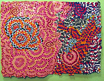 בעבודה הבאה צריך להיות דבר שהוא זהה מכל הכיוונים, כך שאתה לא יודע מאיפה הוא מתחיל והיכן הוא נגמר. הוא נראה אחיד לחלוטין. והוא מורכב מחלקיקים שווים. מה שהולך לקרות זה שיהיה לי עיגול וכל המשולשים האלה, אני פשוט אסדר אותם. אני אתחיל באחד המקומות בשולי העיגול, לא במרכז. גם המרכז יוצר אובייקט, וכל דבר שיוצר אובייקט הוא פסול מבחינתי בתור הנחת עבודה. אז העיגול הזה יהיה מכוסה בחלקיקים שווים ובאחידות. זה צריך להיות אחיד וחוזר על עצמו, כך שאני לא אצטרך לחשוב בכלל. זו המטרה, שאני לא אצטרך לחשוב בכלל בזמן שאני יוצרת את זה. זה יהיה מובן מאליו, ואני לא אצטרך לבחור. שיהיה שם רק דבר אחד לדעת ושום דבר אחר.