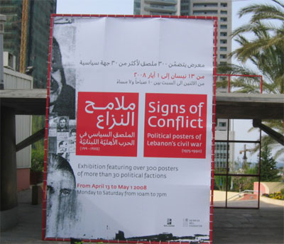 מתוך "חומר לסרט", אמילי ג’אסיר האמן הלבנוני הצעיר זייאד אנטר העניק אתנחתא קומית עם שני סרטי הוידאו שלו "מארש טורקי" “La Marche Turque” (2006) ו"החבל" “La Corde” (2007). בראשון נראה זוג ידיים מנגנות את היצירה מארש טורקי מאת מוצרט על פסנתר אלקטרוני מושתק, כשברקע נשמע רק קול הנקישה הקצבית על הקלידים. בשני, בחור צעיר קופץ בחבל. בתחילה תנועותיו פשוטות, אך ככל שהן הופכות נועזות ומורכבות יותר, בכל פעם שהוא מסתבך בחבל הוא משיל מעליו פריט לבוש במעין ואריאציה לחבל של סטריפ פוקר. שתי הפעילויות נראות חסרות תועלת: מוסיקה ללא קול, מעגל אינסופי של ניסיונות קפיצה כושלים. אך האבסורדיות שבניסיונות כושלים אלה שאין להם מטרה היא שהופכת את עבודותיו של אנטר להערות שובות לב ומשעשעות על מצבה העכשווי של לבנון. מתוך סרט הוידאו "החבל", זייאד אנטר זיינה מאסרי, פרופסור לעיצוב גרפי באוניברסיטה האמריקנית בביירות (A.U.B.) עוסקת במצבה של לבנון בתערוכה "סימנים של סכסוך: כרזות פוליטיות של מלחמת האזרחים בלבנון (1975-1990) (“Signs of Conflict: Political Posters of Lebanon’s Civil War (1975-1990)”) המציגה יותר משלוש מאות כרזות של יותר משלושים סיעות פוליטיות. מאסרי אוספת וחוקרת את הכרזות משנת 2003. שם התערוכה נבחר בקפידה: הפעולה ארכיאולוגית שמבצעת מאסרי במורשת התרבות החזותית הקודרת, משחזרת בהכרח את תולדות התעמולה והמניפולציה הפוליטית בלבנון באופן פתוח וביקורתי. הוצאת איי.בי. טאוריס מתעתדת לפרסם ספר בנושא בהמשך 2008 , כמו גם להעלות מסד נתונים אינטרנטי נגיש לציבור הרחב (ב-2009). על אף הפורמט הדידאקטי קמעה, התערוכה הציגה היטב את ריבוי השיח הפוליטי ואת השפות הויזואליות השונות. מתוך סימנים של סכסוך: כרזות פוליטיות של מלחמת האזרחים בלבנון (1975-1990) תוכנית הפנלים, ההרצאות והדיונים הייתה יכולה להיות מוצלחת לו הייתה משקפת את קריאתה של מאסרי לרב-גוניות, ומעניקה תשומת לב לסוגים שונים של שפות קונספטואליות וייצוגיות. למעשה, חלק זה של הפסטיבל היה הלקוי ביותר. אם בגלל תרגום מסורבל, הרצאות לא מוכנות או אסטרטגיה אוצרותית חפוזה, נדמה שרוב הדוברים לא ידעו מי הקהל העומד מולם ומה מטרת האירוע. מושב העוסק במחבלים מתאבדים היה מביך – שלא לומר הזוי – במסגרת האמנותיתתרבותית הספציפית הזאת. לא ברור מה ניסו המארגנים והדוברים להוכיח. באופן כללי רמת הניתוח היתה ירודה ושטחית, להוציא את תרומתו של המחזאי הלבנוני רביה מרווה על פרויקט מייצגי. הרצאתו של המשורר הפלסטיני נג'וואן דרוויש על "החיפצון המיני של ישראל בדמיון הערבי" עוררה הרבה ציפיות, אך כגודל הצפייה גודל האכזבה. בעודו מקרין דימויי קומיקס של ח'נדלה, דמות שיצר אמן הקומיקס הפלסטיני המפורסם נג'י אל-עלי, הסתפק דארוויש באמירות שטחיות על יחסי כוחות, בלא לנתח אף לא דימוי אחד (לרבות דימוי בעל דגשים מיניים), אפילו לא את דימוייו של אל-עלי. ואם זה לא מספיק, הארכיטקט והאמן, המבריק בדרך כלל, טוני שקר, הציג גיבוב מהרצאות ומאמרים קודמים, תוך ששילוח ארס לא כל כך נסתר לכיוון החיזבאללה. סוג זה של אסטרטגיות מהווה ניצול לרעה של פלטפורמה ציבורית ומוכיח שוב שאין דבר בלבנון – אפילו לא פסטיבלי האמנות – שיכול להימנע מגוון פוליטי. ייתכן שגילוי זה של אלימות מילולית בישר את המשבר שיפקוד את לבנון שבועיים אחר כך. (1) לדיון מלא בהרצאתו של רקוביץ, ראה: Muller, Nat. “Iraqi Dates, Looted Artefacts and Architectural Parasites: The Redirective Practice of Michael Rakowitz”. http://www.labforculture.org/en/labforculture/blogitem/25933